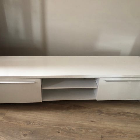 Pent brukt tv-benk med to skuffer. Stått i loftstue. Normal bruksslitasje må påregnes.