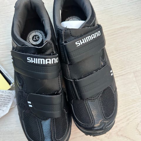 Shimano spinningsko med SPD-klosser i størrelse 38. Modellen er svart med borrelåslukking over vristen for enkel justering. Sålen har grovt mønster for godt grep ved gåing, og er tilpasset SPD-pedaler med monterte klosser. Passer til terrengsykling, pendling eller andre typer sykling som bruker SPD-system.