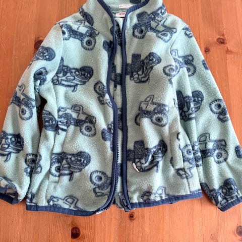 Godt brukt fleecejakke fra Guppy, str 104. Hel og fin, noen bruksmerker og nupper (Se bilder), men masse bruk igjen. Ingen flekker eller hull som jeg kan finne. Motiv av monstertruck.