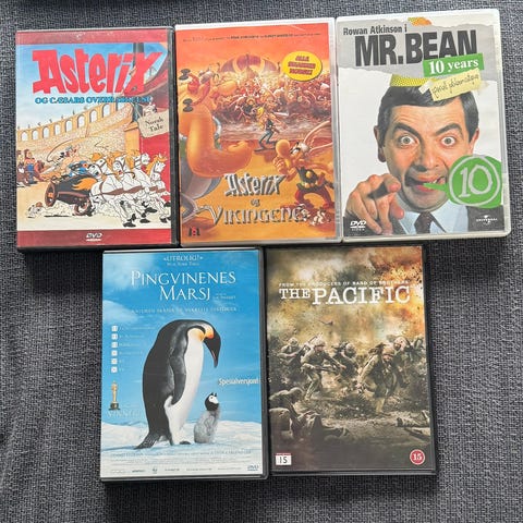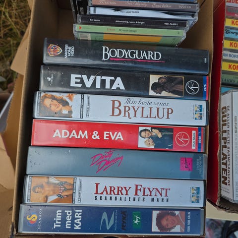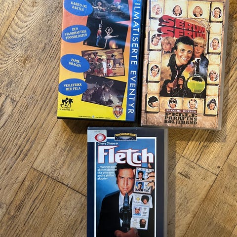 Pakke med ulike videokassetter (VHS) med både spillefilmer og tegnefilm. Blant titlene som kan sees på bildene er blant annet «Lady Jane», «Cold Steel», «Always», «Paul Temple» og en kassett merket «Hollywood cartoon 1». Kassettcoverne har trykk på norsk og/eller engelsk. Egner seg for avspilling på VHS‑spiller for den som ønsker filmer og tegnefilm på fysisk videokassettformat.