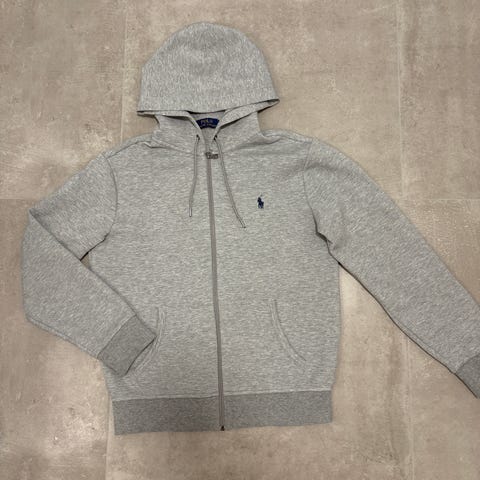 Ralph Lauren hettegenser for herre i størrelse S. Genseren er grå og super deilig og bruke. Modellen har glidelås i front, hette med snøring og to frontlommer. Klassisk liten logo på brystet. Passer til hverdagsbruk og som et lag over t‑skjorte eller skjorte.