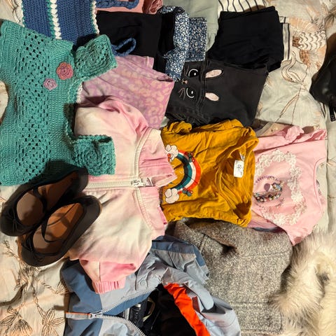 Jenteklær klær i størrelse 128 i flerfargede varianter. Pakken inneholder ulike plagg som overdel, bukser og jakke i forskjellige farger og mønstre. Klærne passer til jente i ca. størrelse 128 og består av flere typer hverdagsplagg egnet til bruk i barnehage, skole og fritid.
