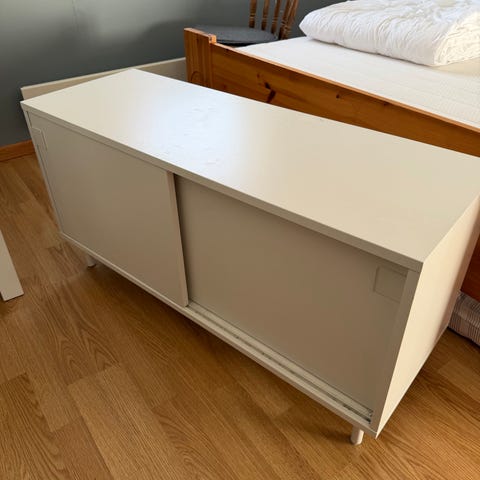 Selger hvit sjeselong/hylle på bein. Ramme er av metal. Er hvit plate i topp og bunn, og glassplate i midten. Selges for 250kr.