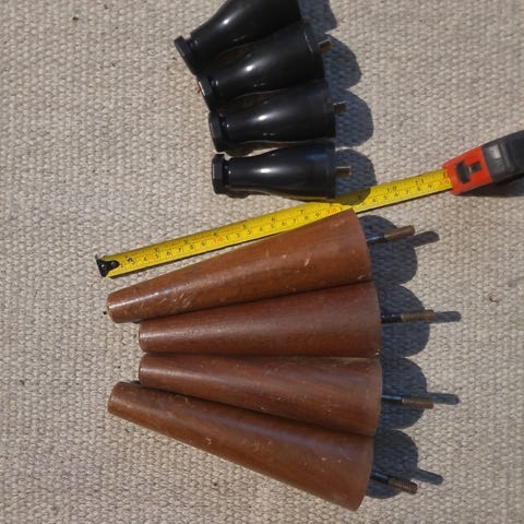 Fire originale koniske møbelben i teak fra en sofa produsert på 1960-tallet. Klassisk skandinavisk retrodesign som er typisk for møbler fra denne perioden.