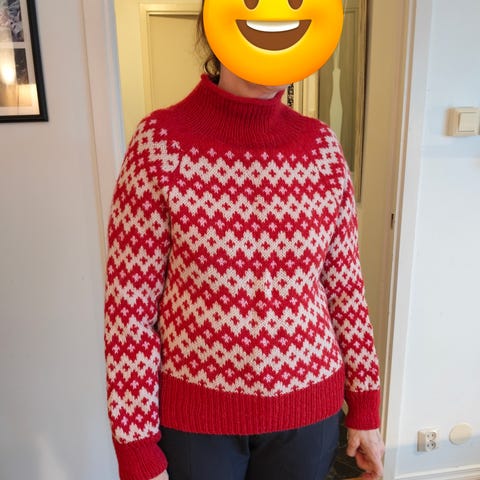Hjemmestrikk. Vidde 118 cm, lengde 68 cm ermer 41 cm. Skal ha en pos. ease på minst 20 cm i følge oppskriften. Selges for mindre en garnpris 1400 kr + porto. Nydelig, myk og god.