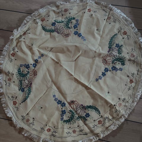 Nydelig håndbrodert duk med hullkant .