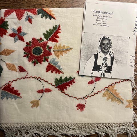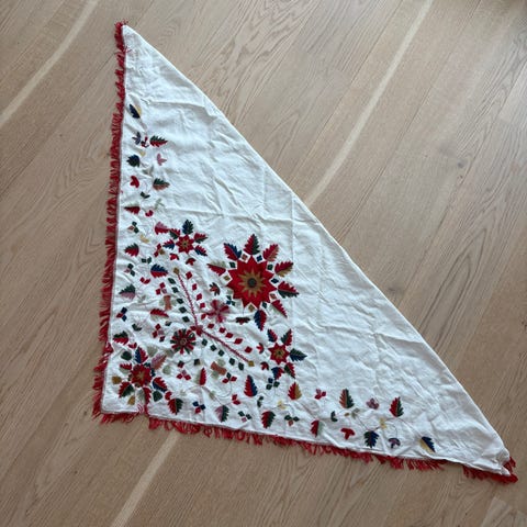 Nydelig skaut i bomull som aldri har vært brukt. Aldri vasket. Har gulnet i stoffet. I følge raskt søk på google kan det bli hvitt ved forsiktig vask i lunkent vann med mildt vaskemiddel som f eks På stell.