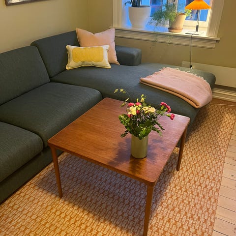 Selger et pent retro stuebord i teak med underhylle. Vanlige bruksmerker i tråd med alder, se bilder. Det er en avflising i enden av rammen på underhyllen der den festes til siden (se bilder). Skaden er på undersiden, påvirker ikke stabiliteten, og hyllen sitter stødig.