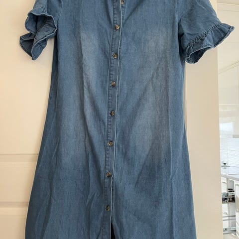 Zizzi hverdagskjole i denim for dame i størrelse M. Kjolen er blå og laget i denimstoff. Den har korte ermer, krage og hel knappestolpe foran. Brystlommer med klaff og knapper gir et skjorteinspirert uttrykk.