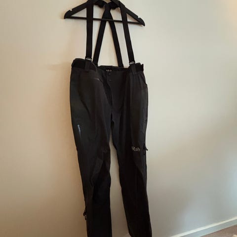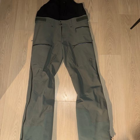 Norrøna Trollveggen Bob for herre i størrelse M. Kun brukt få ganger. Buksen er svart og laget i Gore-Tex-materiale. Den har seler og høyt liv for bedre dekning, samt forsterkede felt nederst på bena. Egnet som regntøy til tur og friluftsbruk i vått vær.