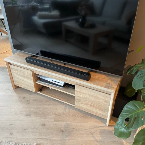Fin tv-benk i lys eikefarge. Modellen heter «Haslund» og er kjøpt på Jysk. Selges grunnet flytting.
