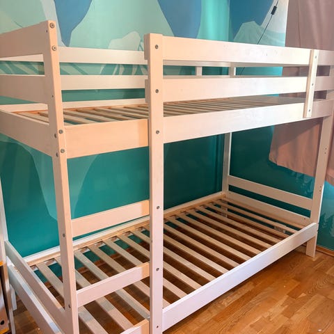 IKEA køyeseng i grå metall med integrert stige i enden. Sengen har øvre og nedre liggeflate med rekkverk rundt overkøya for økt sikkerhet. Rammen er i metall med rette linjer og enkel utforming som passer inn i de fleste barne- og ungdomsrom. Madrasser og sengetøy som vises på bildene følger ikke nødvendigvis med, to enkeltsenger, gis bort helt gratis siden vi flytter. Gis bort UTEN MADRASS