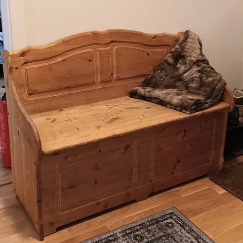 Slagbenk med god plass til oppbevaring selges rimelig.