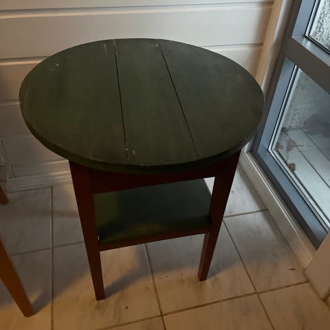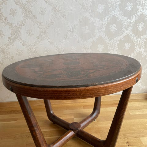 Rundt bord med utskjæringer på sokkelen selges. Bordet er solid og målene er 77cm i diameter og høyden er 60 cm. Bordet har noe bruksmerker og en liten sprekk på sokkelen som vises på bildet.