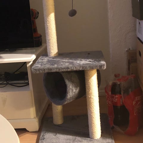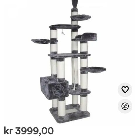 Klatrestativ for katt med flere nivåer i grå tekstil. Nederst er det en lukket hule med åpning foran, som gir katten et skjermet liggested. Over hulen er det en rund plattform, og øverst en høyere liggeplass med kant. Stolpene mellom nivåene er trukket med sisal for kloring. Under den øverste plattformen henger en liten fjærleke. Egnet for innendørs bruk til lek, kloring og hvile for katt.