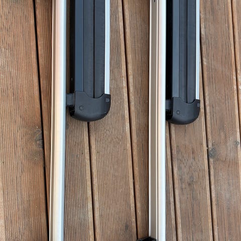 Thule takstativ med lås og nøkler. Takstativet har låsbare endestykker med medfølgende nøkler og festemekanisme integrert i foten. Selve stativet består av tverrstang i metall med plastdeksler og festeanordning for montering på bilens tak. Egnet til montering av takbokser, sykkelstativer eller annet kompatibelt takutstyr fra Thule.