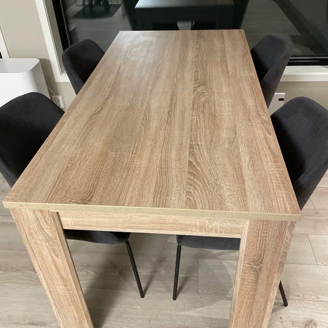 Godt brukt, synlige skader men kan pusses og lakkeres opp. Fungerer fint