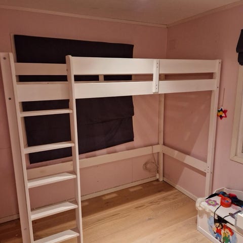 Den er 81x168 i ytre mål. Madrass som er 70x160 vil passe. Ca 80 cm fra gulvet opp til sengebunnen. To av plankene i sengebunnen er erstattet med vanlig plank som sikkerhet.