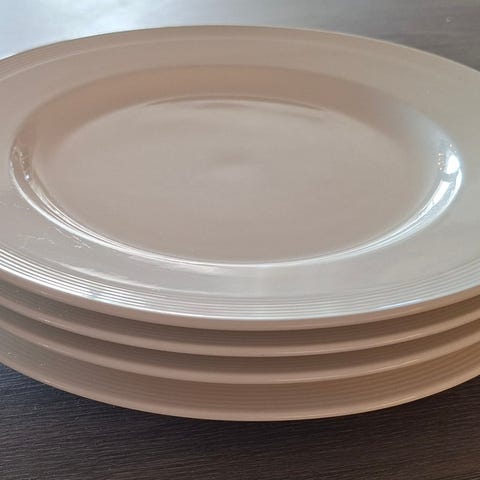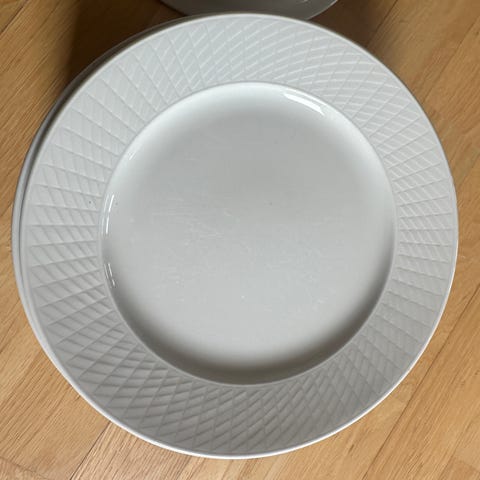 4 tallerkener i flott stand. Ingen skader, noen få svake merker etter bestikk. 20 cm i diameter. Samlet pris 160 kr.