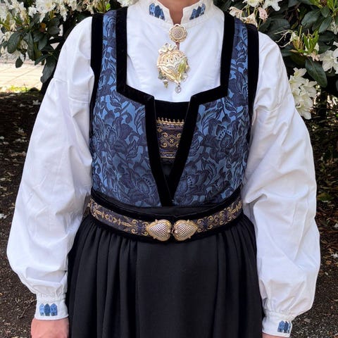 Vurderer salg av min Vestlandssdrakt. Drakten fremstår som ny. Skjorten er str. L. Drakten er L/XL. Bør prøves på. Sjal følger med pluss alt sølv.