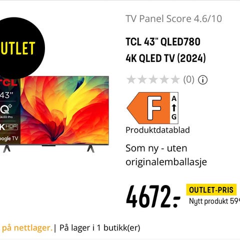 TCL TV. Selges på grunn av liten skade i skjermen. Støvsuger har kommet ann i skjermen. Kjøpt 17.12.2024. kvittering medfølger. Skaden er ca 5 mm. Se bilde.