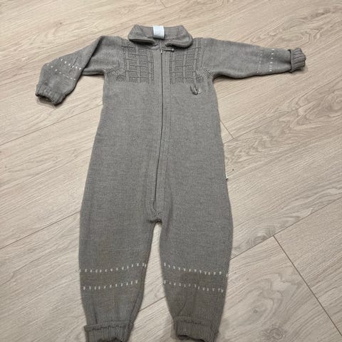 Lillelam ulldress i størrelse 92 for barn. Dressen er laget i ull og er brun/ beige. Den har glidelås foran og strukturmønster øverst på overdelen samt detaljer på ermer og ben. Egner seg som ytterplagg eller mellomlag i kjøligere vær.