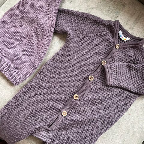 Farge i ulike lillatoner med stripemønster, samt innslag av grått og hvitt. Glidelås foran for enkel av- og påkledning.