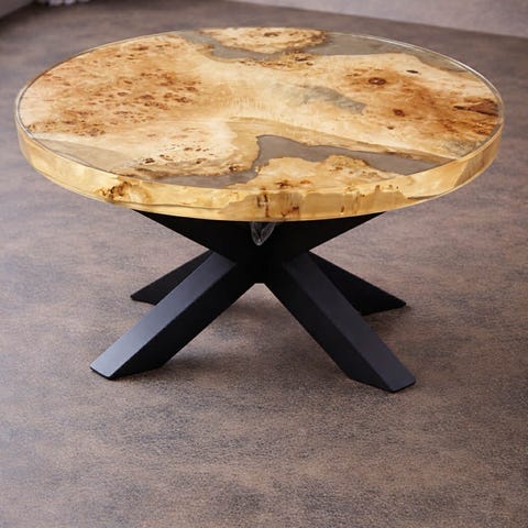 Unikt og håndlaget salongbord som virkelig skiller seg ut. Bordplaten er satt sammen av naturlige furuskiver med synlige årringer og kvister, fylt med blå epoksy. Integrerte LED-lys i epoksyen gjør at bordet lyser opp i vakker turkis/blå farge i mørket.