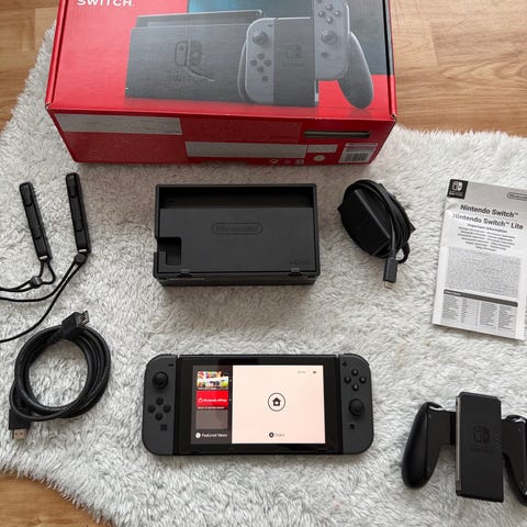 Nintendo switch original med fire joy con fjernkontroller, lader, dockingstasjon og reiseveske.