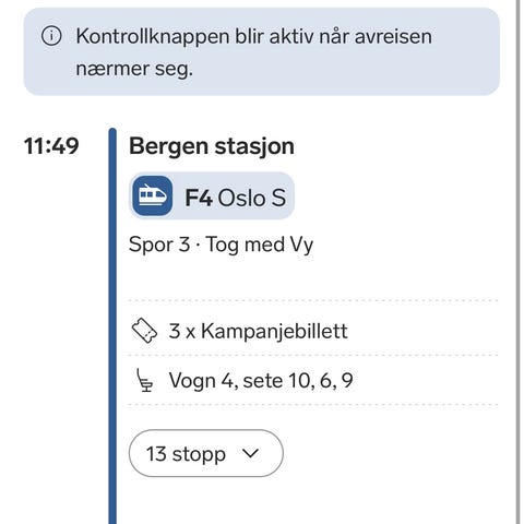 Selger en billett på nattoget fra Trondheim til Oslo, onsdag 4. mars kl 23:15–06:49. Premium pluss. Halv pris.