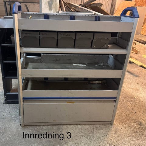 Bilinnredning for varebil med hyllesystem og skuffeseksjoner i stål, i fargene blå og grå. Løsningen består av flere moduler med skuffer i ulike størrelser, åpne hyller og perforerte sideplater med kroker for oppheng. Innredningen er egnet for organisering og oppbevaring av verktøy, smådeler og utstyr i varebil. Kan tilpasses ulike bilmodeller ved ommontering og festes til bilens gulv og vegger etter behov.