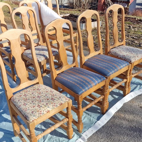 Har en femte stol som har en skade i ryggen. Den kan man få med til en snill pris. Må hentes