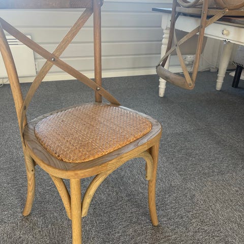 6 Home & Cottage stoler selges til kr 200,- pr stk. 1 av stolene har knekt på den ene siden av ryggen (se bilde stol 5) så gies bort sammen med de andre.