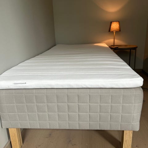 IKEA Skotterud rammemadrass med Hornnes overmadrass. Rammemadrassen har grått trekk med rutemønster og ben i lyst tre. Overmadrassen har hvitt trekk med strukturert overflate. Sengen passer som enkeltseng på soverom, gjesterom eller hybel. Pent brukt i ca et år. Brukt med madrassbeskytter på overmadrass.