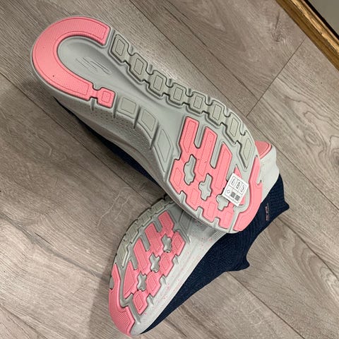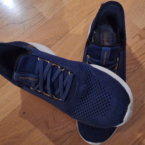 Skechers Slip-ins tursko i størrelse 43. Skoene er blå med hvit såle og har elastisk snøring uten tradisjonelle lisser. Overdelen er i pustende tekstilmateriale, og sålen er utformet for komfort ved gange og lett fottur. Passer til hverdagsbruk og turer til fots.