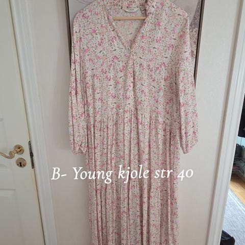Jacqueline de Yong sommerkjole i størrelse 40. Kjolen er flerfarget med blomsterprint og er laget i polyester. Modellen har omslagssnitt med V-utringning, korte ermer og knytebelte i livet. Nederst har kjolen volangkant. Passer til bruk på varme dager eller til hverdagsbruk og enkle anledninger. Det er satt noen sting i utringningen, men disse kan enkelt sprettes opp uten at det synes.