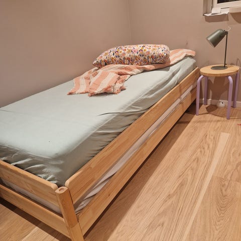 Praktisk IKEA UTÅKER stableseng i furu, størrelse 80x200 cm. Modellen består av to enkle senger som kan stables oppå hverandre som en høy seng eller brukes hver for seg som to enkeltsenger. Ribbebunn er integrert i rammen.