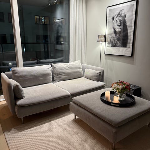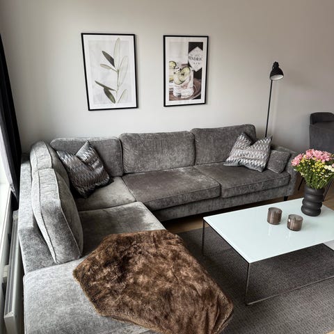 God sofa selges grunnet flytting. Denne sofaen ble selv kjøpt brukt, men det er ikke betydelige sittemerker i putene. Sofaen har noen nupper nederst på rammen (som kan ses på bildet). Må hentes i fjerde etasje uten heis.