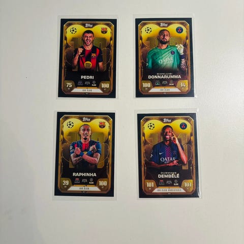 Topps Match Attax Cup Champion fotballkort, med flere spillere fra ulike europeiske klubber. Kortene viser spillerbilde på forsiden med navn, klubb, posisjon og ulike statistikkverdier. Baksiden har Match Attax-design med klubbfarger og logo. Egner seg til samling eller bruk i Match Attax-spillet. Kortene leveres i plastlommer for beskyttelse.