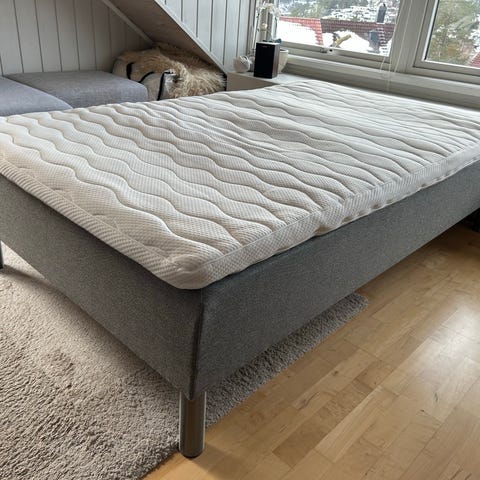 IKEA Sultan Singås rammemadrass lys grå med med hvit overmadrass og madrassbeskytter. Sengeben i lys eik.