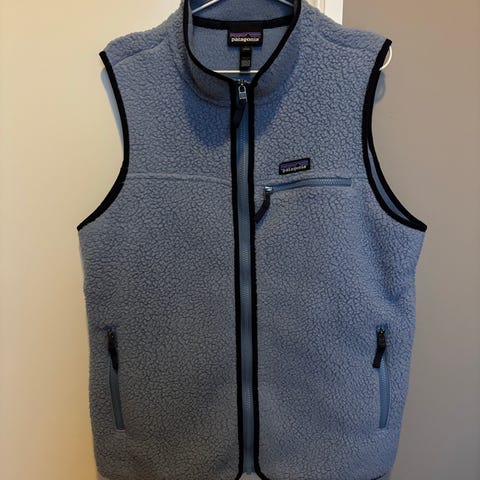 Patagonia fleecevest for herre i størrelse L. Vesten er hvit med kontrastdetaljer langs glidelås og lommer. Modellen har høy krage, gjennomgående glidelås i front, to sidelommer med glidelås og en brystlomme med glidelås. Materialet er myk fleece som gir god isolasjon og komfort. Passer som mellomlag eller ytterplagg i mildere vær.