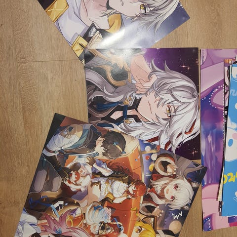 Selger en god del av hva som har dekorert veggene mine de siste årene. Det er da plakater av anime som Rezero, Precure, Love Live, Aikatsu, Madoka Magica, Pripara og Genshin. Cardcaptor Sakura er en clear file og Love Live (2 med grønn ramme) er bokbind, men alt er brukt som plakater. I tillegg er det litt sanrio, sumikko og my little pony. Plakater har spor etter veggtyggis. Noen plakater har små skader, Madoka plakaten er teipet bakpå, derfor alt selges til en ok pris! Kommer med litt freebies i tillegg. Kan hentes i Oslo. Se annen annonse for Honkai Star Rail plakat bundle.