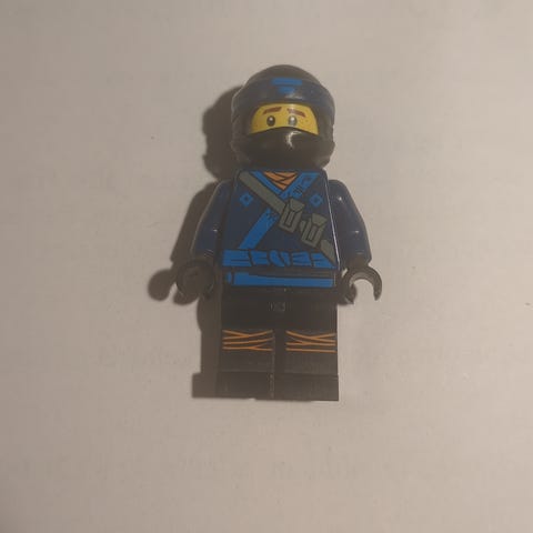 LEGO Technic figur i blå drakt med svarte og hvite detaljer. Figuren har gult hode, svart hår og avtagbar svart hjelm. Passer til LEGO Technic-sett og som ekstra figur i lek eller samling.