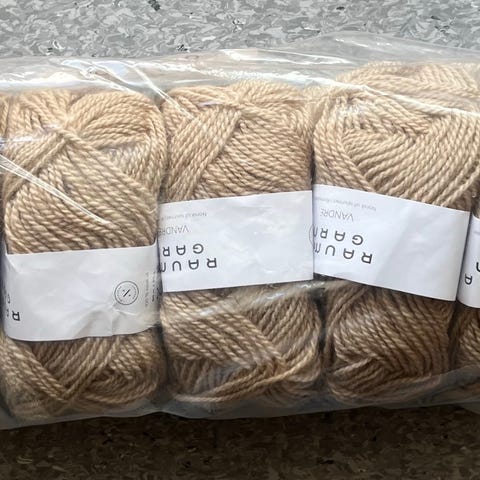 Selger 8 bunter Rauma ryegarn, og noen rester. Overskuddsgarn av knyttet teppe.