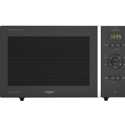Whirlpool Gusto mikrobølgeovn i svart utførelse. Modellen har front med dør i glass og håndtak i metall, samt betjeningspanel med dreiehjul og knapper på høyre side. Innvendig er det roterende glassplate. Egnet til oppvarming og tining av mat i kjøkken eller pauserom.