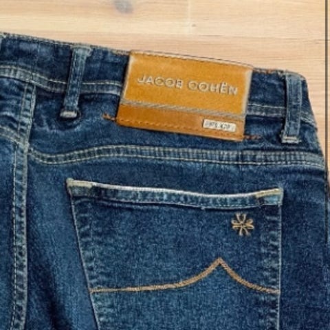 Jacob Cohën jeans for herre i blå denim. Italiensk hpndsydd kvalitet. Model 622 . Buksen har livvidde W33 og tilsvarer størrelse M. Klassisk 5-lommers modell med beltehemper og knapp-/glidelåslukking. Materiale i denim (bomullsjeansstoff) som gir et typisk jeanspreg med lett vaskede detaljer. Lite merke bak på venstre lår, se bilde