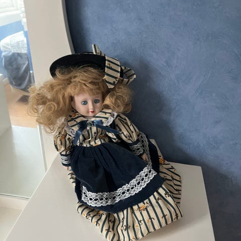 Dette er en typisk samlerdukke med hode, hender og føtter i porselen og en myk kropp. Perfekt som dekorasjon i en bokhylle, på et barnerom eller som tilskudd til en dukkesamling. Kaa sendes mot porto