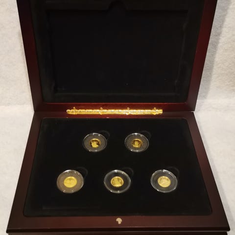 Hver gullmynt veier 1/25 oz (1,24 gram), å er preget i 999 gull.