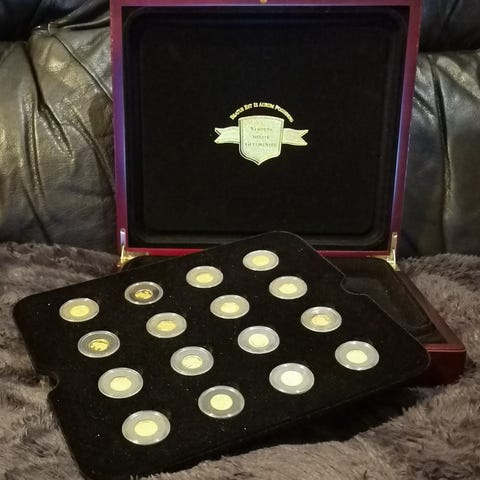 16 flotte gullmynter samlet i et skrin, desverre mangler sertifikater og lupe.