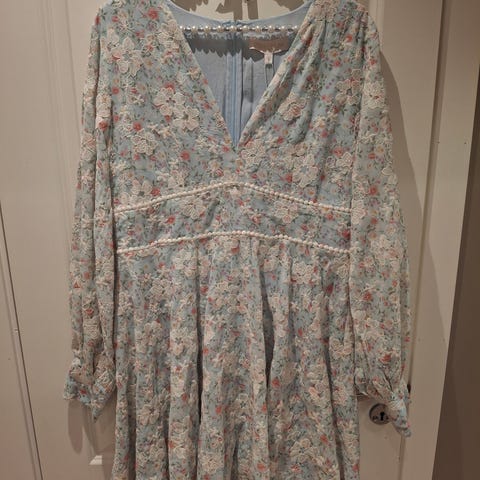 Floyd sommerkjole i størrelse XXL. Kjolen er hvit med blomstrete mønster og har lange ermer. Den har innsvinget midje med strikk, volangdetaljer nederst på skjørtet og blondedetaljer på overdel og ermer.
